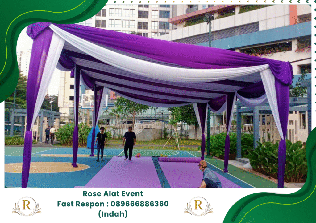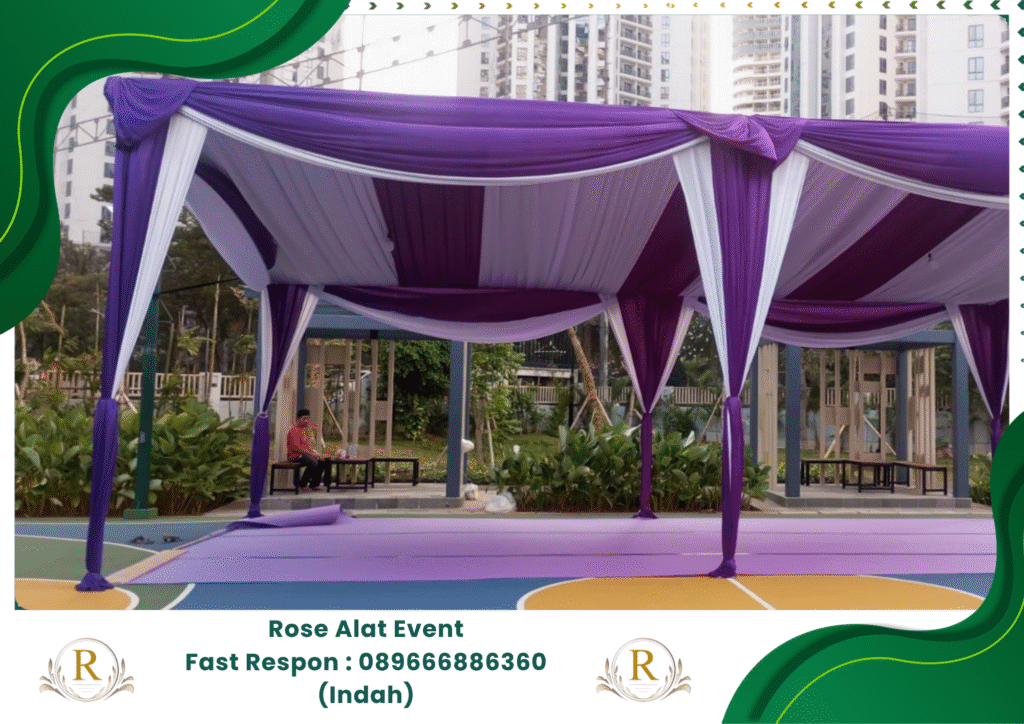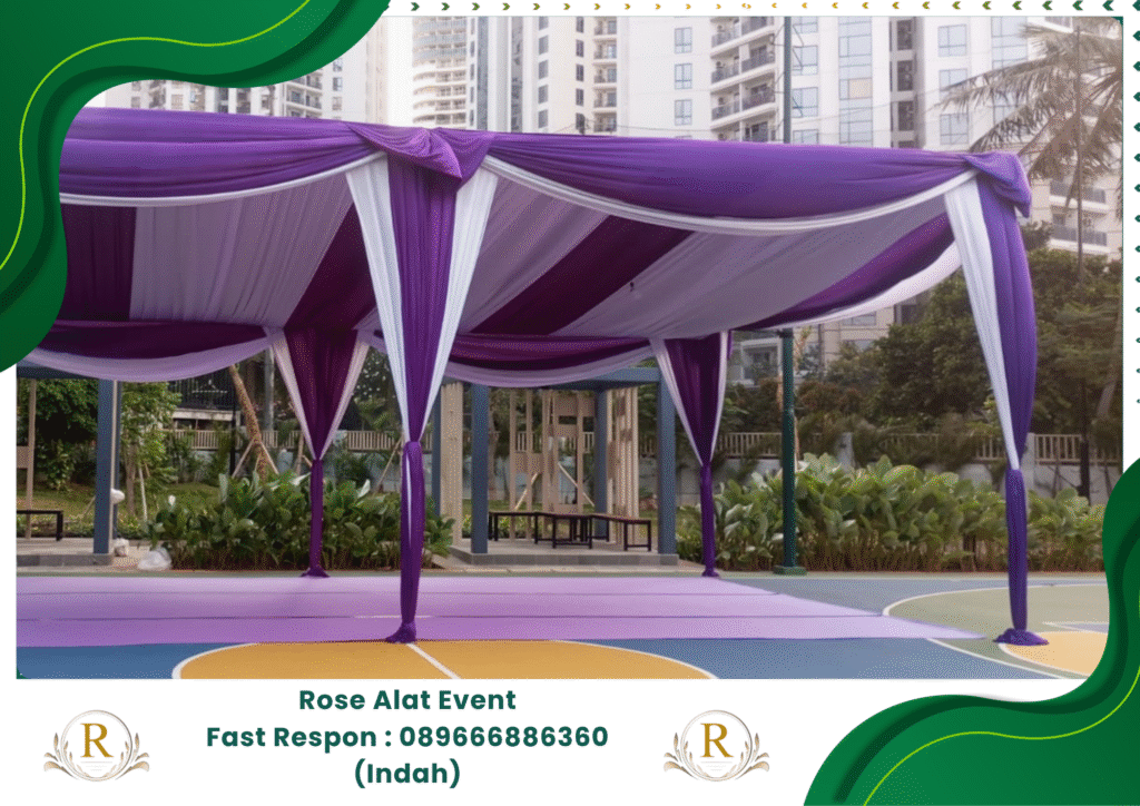 Kemudian untuk produk sewa kali ini yaitu ada tenda serut yang berkualitas terbaik, kokoh, dengan kombinasi warna ungu dan putih menjadikan tenda terlihat mewah, elegan, dan berkelas. Perpaduan ini sangat populer untuk acara pernikahan atau pesta VIP karena memberikan nuansa anggun dan bersih.